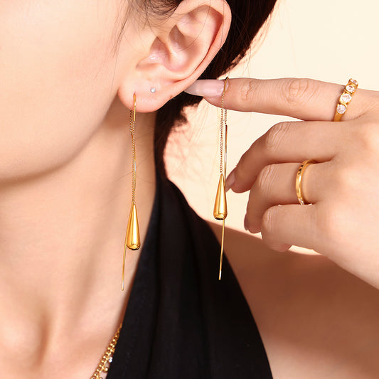 Waterdrop Thread & Wave Needle Earrings - 18K Gold-Plated Stainless Steel